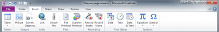 OneNote kan allerhande informatie opslaan. Tekst, afbeeldingen, schermafdrukken, tabellen, koppelingen naar websites, bestanden, scans, opgenomen audio, opgenomen video, de datum, een vergelijking, wiskundige en andere symbolen en nog veel meer. De hier genoemde soorten informatie zijn de belangrijkste, u kunt ze allemaal zien door het Lint (Ribbon) zichtbaar te maken, waarover meer in tip 7. Klik op Insert om alle verschillende categorieën te zien.