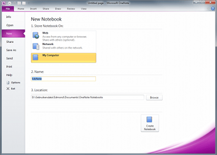 Zoals gezegd, werkt OneNote met Notebooks. Een Notebook is voor OneNote wat een document is voor Word. Het is het standaardformaat van een kladblok in OneNote en het is ook een bestand op de harde schijf. Om met een nieuw Notebook te beginnen, klikt u op File, New en selecteert u My Computer als locatie om het Notebook op te bewaren. Typ vervolgens in het veld bij Name een naam voor het Notebook en klik op Create Notebook.