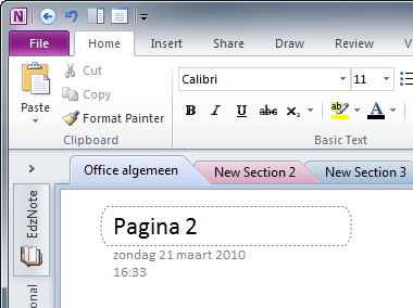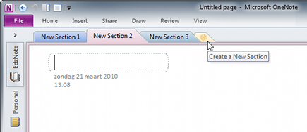 De Secties staan bovenin het Notebook, onder de menulijst. Standaard is er één Sectie, maar er kunnen er meer worden gemaakt. Klik op de meest rechtse Sectie, die met het tabblad waarop een sterretje staat. OneNote maakt dan direct een nieuwe sectie aan en voegt die links ervan in. Het tabblad met het sterretje hoort dus altijd bij de meest rechtse Sectie, die is daardoor gemakkelijk te vinden.
