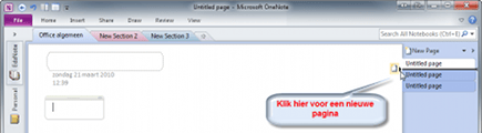 Om een nieuwe pagina te maken klikt u op de knop New page aan de rechterkant. Pagina's staan in de rechterkantlijn van het OneNote-venster, onder elkaar. Een andere optie om een pagina toe te voegen, is door met de muis onder de tab van een pagina te gaan staan, even stil te houden en te wachten tot er een zwevende optie voor het maken van een nieuwe pagina in beeld komt. Klik op die optie om een pagina aan het kladblok toe te voegen.