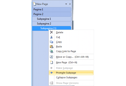 Om de labels van de pagina's goed leesbaar te maken, kunt u op het pijltje helemaal rechts boven de lijst met pagina's klikken. Hiermee activeert u de functie Collapse Page Tabs, waarmee u de paginalabels in- en uit kunt klappen. Wilt u de subpagina's bij een pagina helemaal niet zien, omdat u de informatie op die pagina's niet nodig hebt, klik dan met de rechtermuisknop op het label van de pagina en kies Collapse subpages. Wilt u een subpagina tot hoofdpagina maken of een sub-subpagina 'minder sub', klik dan met de rechtermuisknop op het label van die pagina en kies Promote Subpage. Om een hoofdpagina juist tot subpagina te maken, klikt u op het label van de pagina en kiest u voor Make subpage.