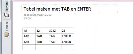 Via Insert, Table kunt u een tabel invoegen in een OneNote-pagina. Maar dat kan ook anders en vaak is de alternatieve methode sneller en flexibeler. U hoeft daarbij bijvoorbeeld niet vooraf te bepalen hoeveel rijen en kolommen er nodig zijn. Klik in een OneNote-pagina en tik eerst de tekst of een getal dat in de eerste cel van de tabel moet komen. Druk dan de Tab-toets in en zie hoe OneNote de informatie in een cel plaatst en de cursor doorschuift naar de volgende cel. Voer de gegevens in die in die volgende cel moeten staan en gebruik wederom de Tab-toets om naar de volgende cel te gaan. Wilt u de rij afsluiten en naar de rij eronder gaan, dan drukt u niet op de Tab- maar op de Enter-toets. Zo kunt u razendsnel gegevens in een tabel invoeren.
