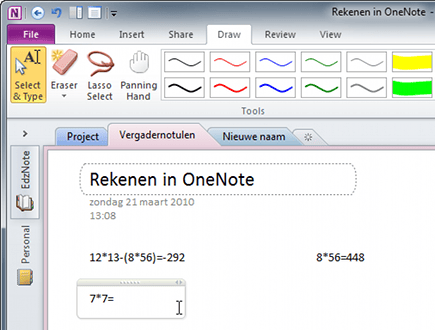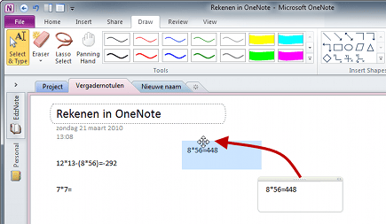 Binnen OneNote kunt u ook berekeningen uitvoeren. De truc om OneNote te dwingen een uitkomst uit te rekenen is een = teken te typen en dan op de spatiebalk of op Enter te drukken. Typ bijvoorbeeld een berekening als 12*13-(8*56) en typ dan een = teken gevolgd door een spatie. OneNote toont nu direct de uitkomst van deze som.