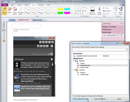 Een heel handige functie in OneNote is dat u iets dat op het computerscherm is te zien, toe kunt voegen aan een Notebook. Hiervoor is de clipping-functie meegeleverd, die kan worden geactiveerd door de Windows-toets samen met de letter S in te drukken. Het hele scherm bevriest dan, waarna u met de muis een deel van het scherm af kunt bakenen door in het scherm te klikken en de muis met de linkermuisknop ingedrukt te verplaatsen. Is het juiste deel gevangen, dan laat u de muis los. Het vervolgscherm dat verschijnt zal vragen waar in het Notebook u de clipping wilt plaatsen. U kunt hem direct in een Sectie of Pagina plaatsen, maar u kunt hem ook eerst naar het Windows Clipboard kopiëren. Dubbelklik op de naam van de Sectie of selecteer de sectie en klik op Send to Selected Location. Om de gegevens in het tijdelijk geheugen van Windows te plaatsen, kiest u voor Copy to Clipboard.