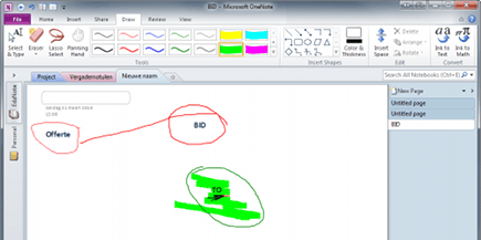 Hebt u een laptop met een aanraakgevoelig scherm of hebt u een tablet-pc? Dan is OneNote een nog mooier programma om te gebruiken! U kunt dan immers direct op het scherm tekenen en schrijven. Met een normale computer kan dit niet, maar ook daarmee is veel mogelijk. Via het onderdeel Draw op het Lint van OneNote kunt u de tekenfuncties oproepen. Klik in het onderdeel Tools op een van de gekleurde lijnen. Verplaats nu de cursor naar de pagina en zie dat de cursor het uiterlijk van de gekozen lijn en kleur heeft. Door nu de linkermuisknop in te drukken en de muis te bewegen, kunt u vrij tekenen op de OneNote-pagina.