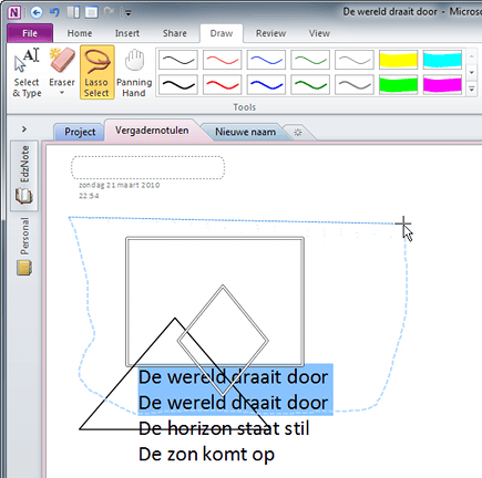 Een wat eigenaardige functie is Lasso Select. Klik op Lasso Select en vervolgens in de OneNote-pagina. Houd nu de linkermuisknop ingedrukt en beweeg de muis zó dat de lus van de lasso om objecten op de pagina komt te liggen. Laat de muis los, waarna alle objecten die door de lasso zijn omcirkeld, samen zijn geselecteerd. U kunt ze nu in één keer verplaatsen. Selecteert u van een tekstblok met vier regels er twee wel en twee niet, dan gaan alleen de twee die door de lasso zijn omcirkeld mee in de selectie.