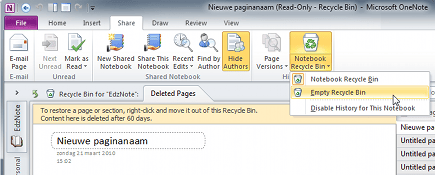 OneNote heeft een eigen prullenbak. Op het tabblad Share vindt u het onderdeel History. Daar kunt u de Notebook Recycle Bin openen en zien wat er allemaal is verwijderd. Alle verwijderingen blijven zestig dagen bewaard en worden daarna definitief opgeruimd. U kunt de prullenbak echter ook tussentijds leegmaken. Klik daarvoor op de onderste helft van de Notebook Recycle Bin-knop en kies Empty Recycle Bin. Bevestig met een klik op Yes.