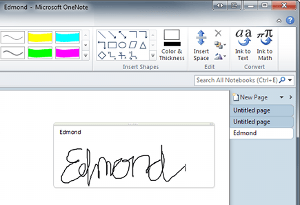 Een andere mooie functie van OneNote, is dat het handschriften kan omzetten in digitale tekst. Met een tablet-pc of tekentablet aan de pc gekoppeld is deze functie helemaal handig. Maar u kunt ook de muis en de tekenfunctie van OneNote gebruiken. Schrijf een tekst op een pagina en zie hoe OneNote die als input accepteert. U kunt de tekst selecteren met de muis en verplaatsen. Maar u kunt ook via Draw, Convert kiezen voor Ink to Text, waarna OneNote de handgeschreven tekst omzet in getikte tekst.