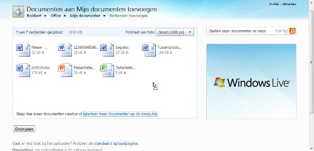 Hebt u nog geen Hotmail-account of wilt u een nieuw account aanmaken, ga dan naar Hotmail en klik op de knop Registreren. Vul uw gegevens in en klik op Ik ga akkoord. U komt na de registratie of het inloggen direct op de homepagina van uw account terecht. Voor het online opslaan van documenten wordt Microsoft SkyDrive gebruikt. De dienst biedt een opslagruimte van 25 GB. Voor u documenten gaat uploaden, raden we aan eerst via SkyDrive de gewenste mappenstructuur aan te maken. Ga linksboven naar Windows Live en klik op SkyDrive. Klik op Nieuw / Map, geef een naam en klik op de knop Map maken. Eventueel kunt u binnen de map meer submappen maken. Voor het uploaden van documenten gaat u naar de gewenste map toe en klikt u op Bestanden toevoegen. Sleep de bestanden naar het venster. Zijn de documenten klaar met laden, dan klikt u op Doorgaan. Vervolgens ziet u de lijst met documenten die u zojuist hebt verstuurd.