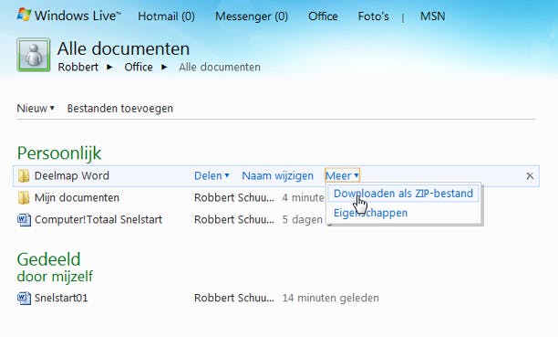 Naast documenten uploaden, kunt u online ook nieuwe documenten maken. Klik op Office / Nieuw. Selecteer het type document dat u wilt maken, geef deze een naam en klik op Opslaan. De bijbehorende Web App wordt gestart en u kunt direct aan de slag met het nieuwe document. Wilt u een document verplaatsen (bijvoorbeeld omdat u dit wilt delen), ga dan met de muiscursor op het document staan en kies Meer / Verplaatsen. Klik op de map waar het document naartoe moet en klik op Document naar verplaatsen. Het is buitengewoon praktisch om bestanden online op te slaan (u kunt er immers altijd bij), maar in de gebruikersovereenkomst van Microsoft staat wel duidelijk dat bij annulering of opschorting u geen aanspraak op uw gegevens kunt maken. Maak dus regelmatig een kopie op uw lokale computer. Een hele map opslaan, doet u door met de muiscursor op een map te gaan staan en te klikken op Meer / Downloaden als ZIP-bestand.