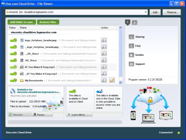 Het gebruik van Cloud Drive is eenvoudig. De Windows-client laat u een aantal mappen selecteren om te synchroniseren en vanaf dat moment doet de software van One.com alles zelf. Als u muziekbestanden in uw Cloud Drive plaatst, wordt automatisch gezocht naar details over de muziek via een koppeling met de Gracenote database. Als u individuele bestanden wilt uploaden, dan kunt u geen gebruik maken van de toepassing, maar moet u de Windows verkenner gebruiken, een alternatieve WebDAV-client zoeken of uploaden via de webinterface.