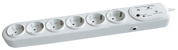 Als al uw computerapparatuur op één plaats staat, kunt u met een master/slave-stekkerblok zelfs op een nog gebruiksvriendelijkere manier stroom besparen. Hierbij wordt de computer aangesloten op het master-contact. De randapparatuur (zoals de monitor, speakers en printer) verbindt u met de slave-contacten op het stekkerblok. Zodra u uw computer uitzet zoals u gewend bent, worden de slave-contacten automatisch stroomloos gemaakt. Inschakelen gaat op dezelfde manier: computer aan, alles aan. Deze stekkerblokken zijn beschikbaar in de smaken 'goedkoop' en 'iets duurdere middenklassers'. Een middenklasse-apparaat is de beste keuze, maar kies dan wel voor een exemplaar met overspanningsbeveiliging (surge protector). Hiermee wordt uw apparatuur beveiligd tegen stroompieken van buitenaf. De praktijk leert dat dit nog weleens voorkomt en dat pc's - en dan vooral de voeding - hier niet tegen kunnen. Met een kleine investering voorkomt u dus veel ellende doordat de surge protector de stroompieken opvangt.