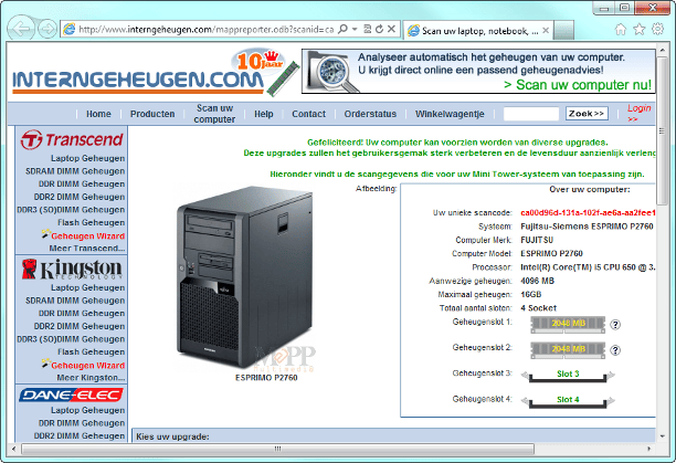 Bezoek www.interngeheugen.com, doe de geheugenscan en u ziet direct welk type geheugen geschikt is voor uw computer.