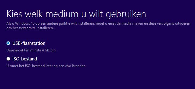 In de volgende stap wordt gevraagd wat voor soort medium je wilt maken: een usb-station of een dvd-station. Welke optie je hier kiest hangt af van een aantal scenario's. Als je computer die je wilt upgraden geen dvd-station heeft, kies je natuurlijk voor een usb-stick. De stick moet leeg zijn en minimaal 4 GB opslagcapaciteit hebben. De meeste computers ondersteunen het opstarten vanaf een usb-stick, bijvoorbeeld door net na de bios-start van je computer op de F10 of F12-toets te drukken om een bootmedium te selecteren.