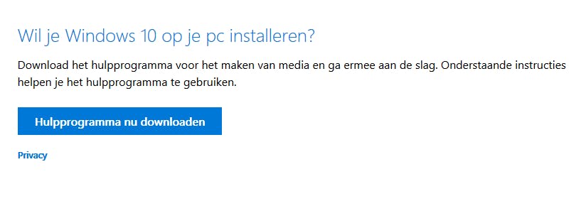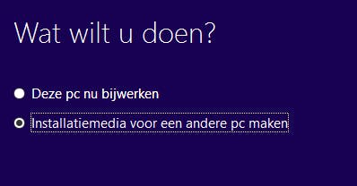 Download de tool en start deze. Na enkele ogenblikken krijg je een vraag te zien: Deze PC nu bijwerken of Installatiemedium voor een andere PC maken. Kies voor de tweede optie: