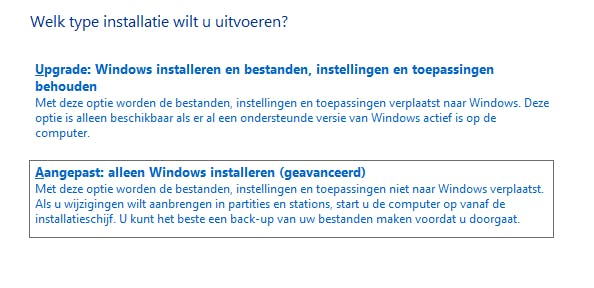 Na het accepteren van de voorwaarden kun je kiezen hoe je Windows 10 wilt installeren. Heb je je oude computer voorzien van een lege ssd, dan kun je kiezen voor de optie Aangepast: alleen Windows installeren. Als je je oude Windows 7- of 8-installatie wilt overschrijven kies je eveneens voor die optie.