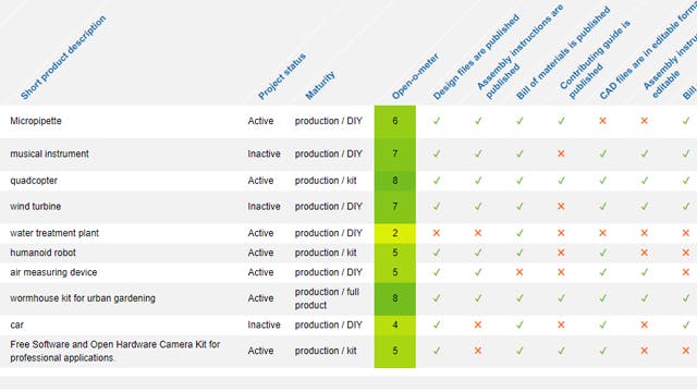 Een minder uitgebreide maar wel beter onderhouden website is die van het ‘Observatory of Open Source Hardware’. Die heeft enkele strenge selectiecriteria. Zo mogen de projecten niet puur elektronisch zijn, het moet om iets origineels gaan, iets functioneels en met een levendige community. Momenteel staan er 225 producten in de lijst, onder andere quadcopters, humanoïde robots tot een kit om insecten te kweken, windturbines en een sensordoos om een bijenkast te monitoren. Bij elk project zie je aan de Open-o-meter in één oogopslag hoe open de hardware is.