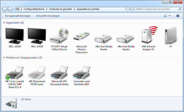 Via Apparaten en Printers laat Windows een mooi overzicht van de randapparaten zien, inclusief uw printers.