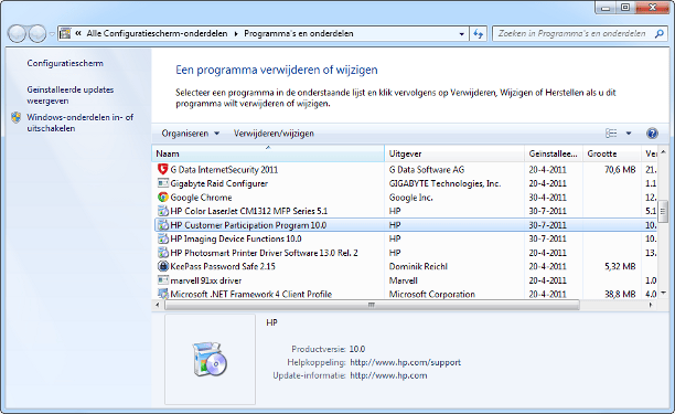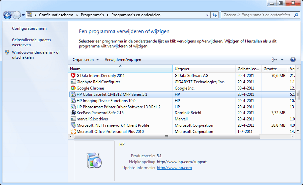 Is de nieuwe driver geïnstalleerd, open dan het onderdeel Start / Configuratiescherm / Programma's en onderdelen. In de lijst met geïnstalleerde programma's staat nu als het goed is de driversoftware voor de printer. Vermoedelijk vindt u er echter ook extra software die met de printer is meegekomen of die ongevraagd is geïnstalleerd. Bovenaan de lijst ziet u een reeks kenmerken staan, zoals Naam, Uitgever en Geïnstalleerd op. Klik op Geïnstalleerd op en doe dat eventueel nog een keer, zodat u binnen de sortering de software bovenaan ziet die als laatste is geïnstalleerd. Zo ziet u direct welke software met de printerdriver is meegeïnstalleerd. Selecteer eventuele onderdelen die u niet gebruikt of die voor problemen kunnen zorgen en klik op Verwijderen. Deze manier van controleren en opschonen is ook handig als u het bij de vorige tip niet hebt aangedurfd om af te wijken van de standaardinstallatie. Dit werkt ook prima wanneer de fabrikant in het installatieprogramma van de driver geen optie biedt om onnodige onderdelen weg te laten of wanneer de driver al op uw computer was geïnstalleerd toen u de computer kocht.