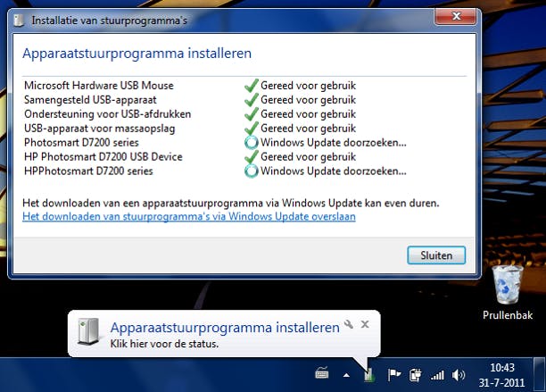 De twee meest voorkomende manieren om een computer met een printer te verbinden zijn via usb of via het netwerk. Bij usb is er een directe verbinding en kan er technisch gezien niet zo heel veel worden gecontroleerd. Zolang de printer staat vermeld bij Apparaten en printers 'ziet' de computer de printer. Is dat niet het geval? Maak de printer los van de computer door de usb-kabel uit de usb-poort te halen. Steek hem in een andere usb-poort terwijl de computer is ingeschakeld en u bent ingelogd in Windows, liefst met een account met administrator-rechten. Bij de klok in de Taakbalk zou nu een pop-up moeten verschijnen met de melding dat er nieuwe hardware is gevonden. Windows zal ook de driver installeren vanaf de computer, omdat het de printer al kent via een andere verbinding, of gaan zoeken in Windows Update. Verschijnt er geen pop-up over de gevonden hardware, vervang dan eerst de usb-kabel of verbind de printer eens met een andere computer. Door verschillende combinaties uit te proberen, kunt u achterhalen welk onderdeel de storing veroorzaakt.