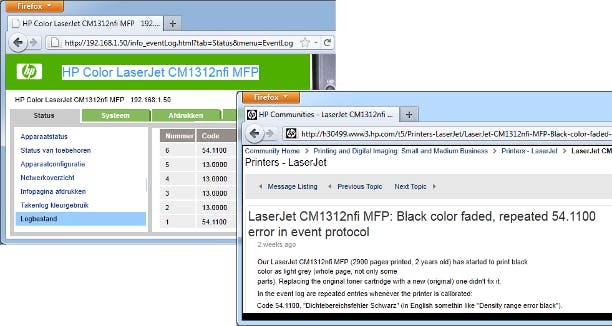 Behalve configuratie-informatie levert het inloggen op de webinterface van een printer nog een andere functie op die kan helpen bij het oplossen van problemen met de printer. De printer houdt de belangrijke gebeurtenissen bij in een logboek. De meldingen die daarin staan, kunnen u helpen de problemen bij het afdrukken op te lossen. Kijk in de webinterface naar Logfunctie of Logboek. U komt dan op en locatie terecht waar u vaak zeer cryptische meldingen, of alleen maar getallen tegenkomt. Samen met de naam van de fabrikant van de printer en het model kunnen die codes via Google extra informatie opleveren over oplossingen, vooral bij complexe problemen.