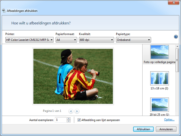 Het is ook lastig als een afdruk niet op het papier past. A4, het meest gebruikte printformaat en voor veel printers het enige formaat waarop kan worden afgedrukt, is niet zo heel groot en foto's in hoge resoluties kunnen gemakkelijk een stuk groter uitvallen. Grafische programma's bieden vaak de mogelijkheid een afdruk te schalen naar een papierformaat zoals A4. Microsoft Paint kan dit bijvoorbeeld niet, maar een gratis programma als Windows Live Photo Gallery is er wel toe in staat. Via Bestand / Afdrukken kunt u in dat programma voor Papierformaat kiezen. Andere grafische programma's bieden soortgelijke afdrukopties.