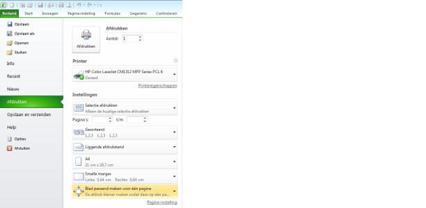 Behalve foto's kunnen ook documenten te groot zijn voor het papier waarop ze moeten worden afgedrukt. Veel programma's bieden inmiddels de mogelijkheid een afdruk te herschalen naar één A4, of zelfs om meerdere pagina's op één A4 af te drukken. In Word vindt u via Bestand / Afdrukken opties om het papierformaat te kiezen, maar bijvoorbeeld ook de optie Aantal pagina per vel. Bij Marges kunt u bovendien standaardmarges of smalle marges kiezen. De laatste optie levert het grootste printbare gebied op het papier op. In Excel is nog een andere extra optie belangrijk. In dit programma kunt u selecteren wat u wilt afdrukken, bijvoorbeeld door te kiezen voor Actieve bladen of juist voor Selectie afdrukken, waarbij u voor die laatste mogelijkheid een deel van het spreadsheet moet selecteren voordat u kunt gaan printen. Daarnaast kunt u Papiersoort en Marges instellen, maar ook het Blad passend maken voor één pagina. In dit laatste geval zorgt Excel ervoor dat het op één A4-tje past, zonder dat u daar zelf verder iets voor hoeft in te stellen.
