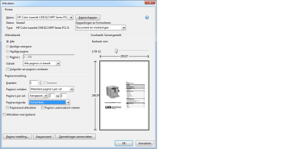 Pdf is een veelgebruikt formaat om documenten te verspreiden. Voor het gebruik ervan hebt u een 'viewer' nodig. Adobe Reader leest de printinformatie en toont die op het scherm. Als u het document wilt afdrukken, dan wordt de pdf precies geprint zoals de maker ervan het ooit bedoelde. Met de nieuwere versies van Adobe Reader kunt u de pdf ook iets aangepast printen. Kies Bestand / Afdrukken. Selecteer bij Pagina's schalen de optie Meerdere pagina's per vel. Kies het aantal Pagina's per vel, voor twee pagina's naast elkaar is dat 2 op 1. De voorbeeldfunctie wordt nu niet ververst, klik daarom even bij Paginavolgorde op het dropdownmenu, zonder iets anders te selecteren. Dat is genoeg om de preview te updaten. Klik dan op OK.