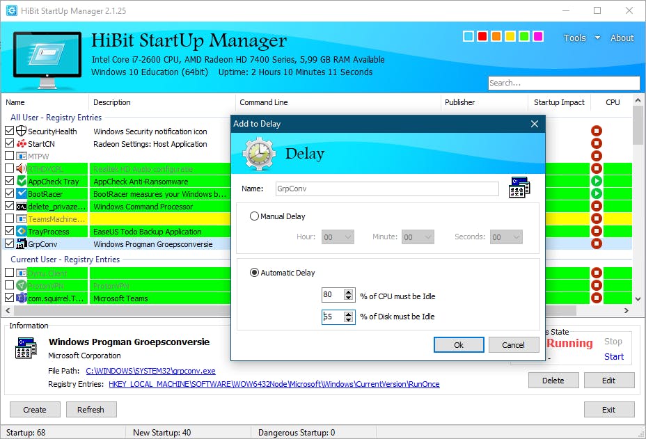 Een nog krachtiger opstartbeheerder die op de wat meer gevorderde gebruiker mikt, is de gratis HiBit StartUp Manager. Download bij voorkeur de Installable version, aangezien de portable versie enkele opties mist. Ook deze tool somt alle autostarters op. Vanuit het contextmenu kunt je via Add to Delay bepalen met hoeveel tijd je het opstarten van een autostarter wilt uitstellen, zodat je het Bureaublad iets sneller te zien krijgt. Via Automatic Delay is het zelfs mogelijk hier randvoorwaarden aan te koppelen, zoals 80% of CPU (of Disk) must be Idle.