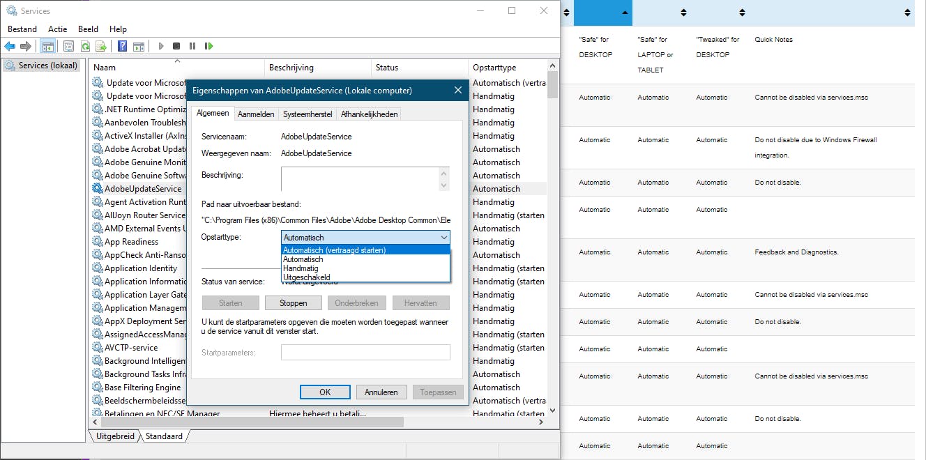 Er is wel een grote ‘maar’! Je mag niet zomaar willekeurige services uitschakelen, want sommige zijn essentieel voor Windows of bepaalde applicaties. Houd er ook rekening mee dat het uitschakelen je doorgaans niet zoveel tijdwinst oplevert. Onderzoek dit dus grondig. Ook hier kan Google je vriend zijn, maar volg niet zomaar elk advies op en raadpleeg verschillende sites. Een handige site is alvastwww.tiny.cc/servconf (scrol naar beneden en kijk vooral in de kolommen Safe for DESKTOP of Safe for LAPTOP). Helaas is deze informatie maar up-to-date gehouden tot Windows 10 1803 uit 2018.