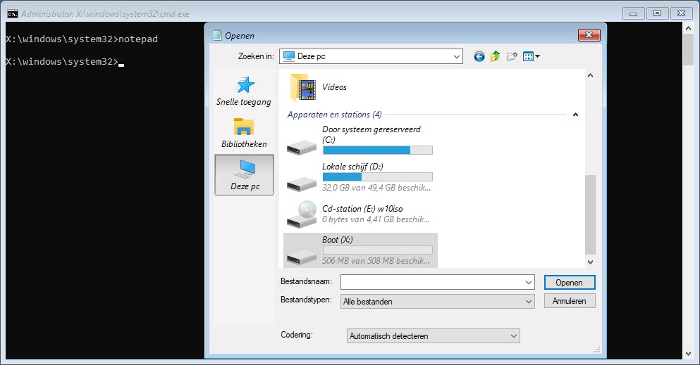 Om uit te vinden welk station dit is, kun je het volgende trucje gebruiken. Voer het commando notepad op de opdrachtprompt uit en kies Bestand, Openen, Deze pc . Open achtereenvolgens de beschikbare stations tot je het Windows-station herkent. Stel dat dit d: is, dan voer je op de opdrachtprompt de volgende instructies uit (bevestig telkens met de Enter-toets):