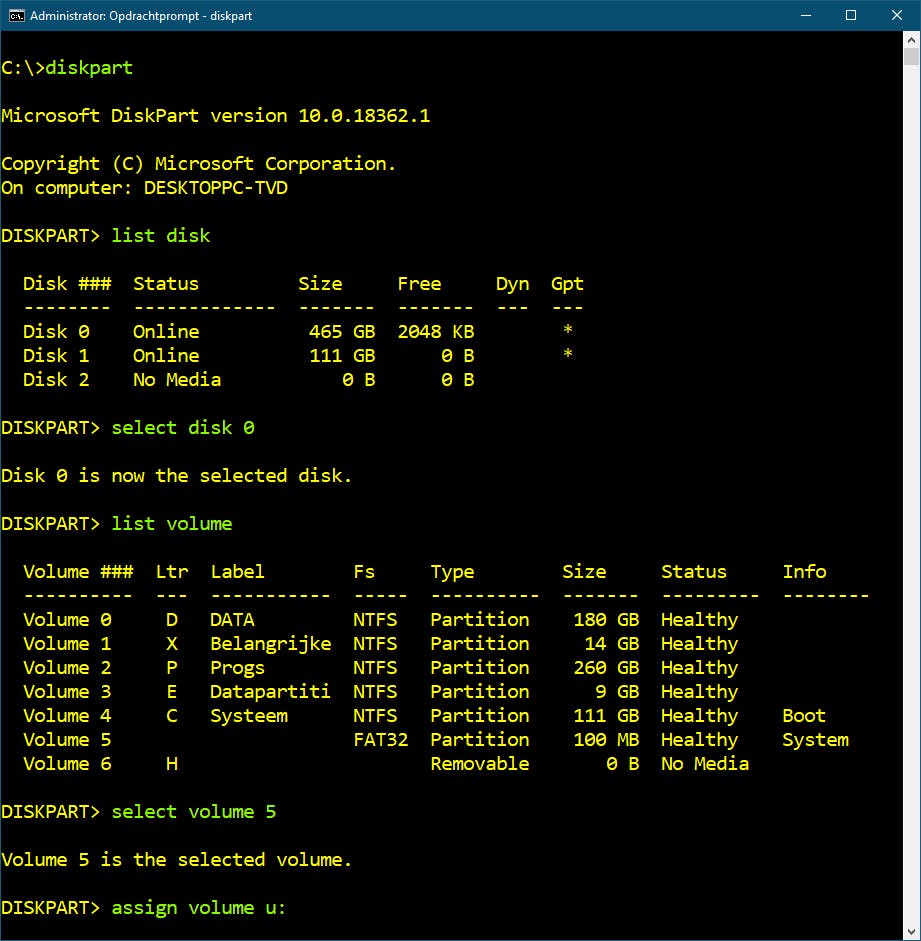 Het is wel de bedoeling dat je<n> vervangt door het juiste volumenummer, namelijk dat van de (verborgen) systeempartitie. Die is normaliter met fat32 geformatteerd en zo’n 100 tot 500 MB groot. De letter <x:> vervang je dan door een (willekeurige) vrije stationsletter. Deze commando’s zouden dus iets kunnen zijn als select volume 4 en assign letter u:.