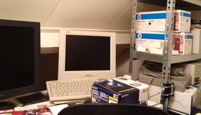 Al mijn oude computers, routers en beeldschermen liggen er opgeslagen. Ik heb daar ook nog eens een - in mijn ogen redelijk geordend - klein kantoortje (lees: hobbykamertje) waar onder meer een werkend Windows-systeem staat met allerlei apparatuur en programma's uit het verleden.