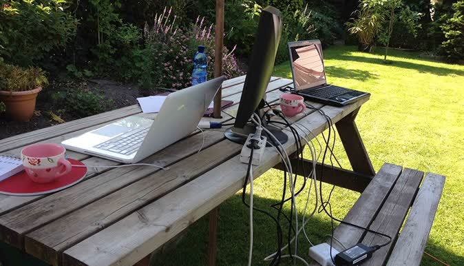 Bij de tropische temperaturen van deze zomer wil ze ook wel graag buiten zitten en dus moet er ook WiFi in de tuin zijn te ontvangen. Oh ja hoor, ik heb ook nog wel een routertje staan en binnen een half uur heb ik zowel internetverbinding als een tweede beeldscherm geïnstalleerd met wat kabeltjes die ik ook nog wel op zolder in een laatje heb liggen.