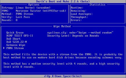 Druk op M om de wismethode te veranderen. Standaard staat deze ingesteld op DoD Short waarbij de schijf driemaal met willekeurige data wordt overschreven. Wij doen geen concessies en gaan voor de veiligste methode die DBAN aanbiedt. Dit is PRNG Stream. Selecteer met behulp van de toetsen J en K de methode PRNG Stream en druk op de spatiebalk. Vervolgens drukt u op R en verandert u 1 in 8 en drukt u op Enter. DBAN is nu optimaal ingesteld, dus drukken we op F10 om de procedure te starten.
