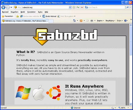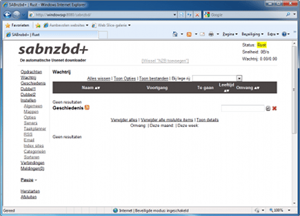 SABnzbd benadert u via een webbrowser, hier zijn we via Windows 7 verbonden met SABnzbd op een Windows XP-pc. U kunt SABnzbd via iedere pc in uw netwerk benaderen en gebruiken.