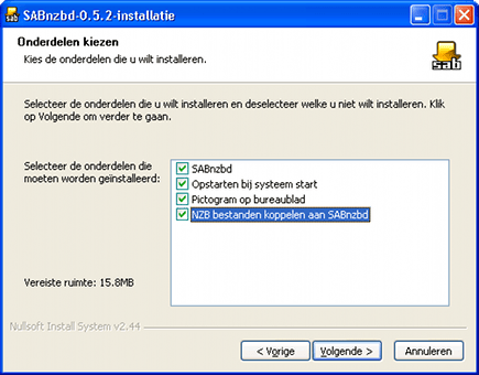 Surf op uw oude Windows XP-pc naar Sabnzbd en klik op Windows Installer in het blok get sabnzbd. Sla het bestand op en voer het uit. Kies Nederlands als taal en ga akkoord met de licentieovereenkomst. U dient vervolgens de onderdelen te kiezen die door het installatieprogramma geïnstalleerd moeten worden. Vink hierbij ook de opties Opstarten bij systeem start en NZB bestanden koppelen aan SABnzbd aan. Voltooi vervolgens de installatieprocedure en zorg dat in de laatste stap de optie Start SABnzbd (verborgen) is aangevinkt voordat u op Voltooien klikt.