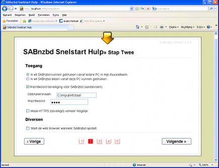 Na het afsluiten van het installatieprogramma, start automatisch uw webbrowser voor de configuraite van SABnzbd. Selecteer Nederlands en klik op Start Wizard. In de eerste stap selecteert u smpl als uiterlijk. De tweede stap is belangrijk, vink onder Toegang de optie Ik wil SABnzbd kunnen gebruiken vanaf iedere PC in mijn thuisnetwerk aan. Vink eveneens de keuze Wachtwoord beveiliging voor SABnzbd (aanbevolen) aan en vul een zelfgekozen gebruikersnaam en wachtwoord in. Vink de optie Start de web browser wanneer SABnzbd opstart uit. Klik vervolgens op Volgende.