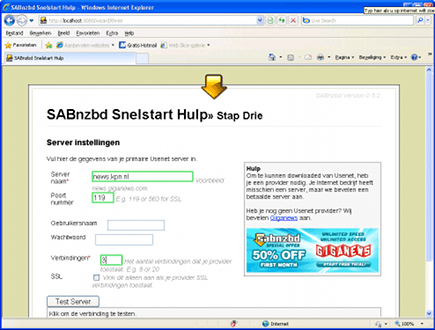 In de derde stap van de configuratie dient u de gegevens van uw nieuwsserver in te voeren. Gebruikt u een nieuwsserver van uw internetprovider, dan vindt u deze gegevens terug op de website van uw internetprovider. U dient in ieder geval de servernaam en het poortnummer op te geven. De gebruikersnaam en het wachtwoord zijn optioneel en zijn vaak alleen nodig als u een betaalde nieuwsserver gebruikt. Verder dient u het aantal verbindingen dat tegelijkertijd is toegestaan op te geven in het veld Verbindingen.