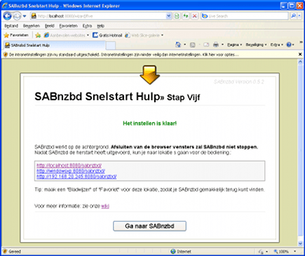 De vierde stap is optioneel, u kunt dus op Volgende klikken, waarna SABnzdb opnieuw wordt gestart. Wanneer u een melding krijgt van Windows Firewall, dan klikt u op Blokkering opheffen. SABnzbd zal nu de adressen tonen die u nodig hebt om via de webbrowser het programma te benaderen. Het eerste adres gebruikt u als u op de oude pc zelf werkt. Voor toegang vanaf een andere pc in uw netwerk kunt u de twee andere adressen gebruiken. Sla de drie getoonde adressen op, zodat u ze later kunt gebruiken. De eerste configuratie is nu voltooid, dus kunt u klikken op Ga naar SABnzbd.