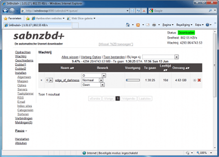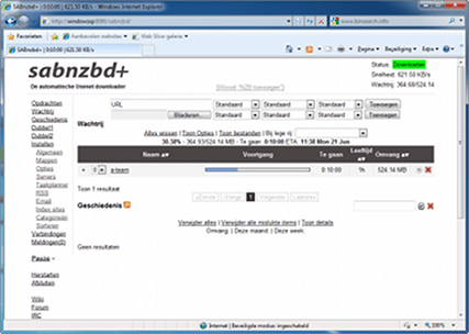 Via de knop Bladeren voegt u zogenaamde nzb-bestanden toe waarmee u SABnzbd de opdracht geeft om bestanden vanaf een nieuwsserver automatisch te downloaden. De voortgang van een download wordt getoond in procenten en in tijd. Rechtsboven in beeld ziet u met welke snelheid SABznbd vanaf de nieuwsserver downloadt.