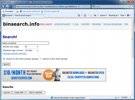 Voor het downloaden van bestanden vanaf nieuwsgroepen kan SABnzbd zogenaamde nzb-bestanden gebruiken. Hiermee worden alle losse bestanden die nodig zijn om een groter bestand te downloaden automatisch in één keer gedownload. Een handige website waar u nzb-bestanden kunt downloaden is de website Binsearch. Op onze website vindt u een workshop voor het gebruiken van Binsearch.info. Hebt u via bijvoorbeeld Binsearch een nzb-bestand aangemaakt, sla deze dan ergens op uw pc op.