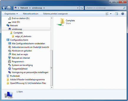 De gedeelde mappen waar SABnzbd de gedownloade bestanden in opslaat en waar u de nzb-bestanden in kunt zetten, zijn te benaderen via de verkenner op uw Windows 7-pc. Tik in het adresveld van de verkenner \\computernaamvanwindowsxppc\. Als u de computernaam niet weet, dan heeft SABnzbd deze u getoond in stap 5 van deze workshop. Daar toonde SABnzbd als tweede adres iets als http://computernaamvanwindowsxppc:8080/sabnzbd/. De computernaam uit dit adres kunt u gebruiken in de verkenner van Windows 7 om uw Windows XP-pc te benaderen.