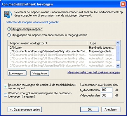 We gaan Windows Media Player 11 gebruiken om muziek te delen met andere pc's in uw netwerk. Hiervoor dient u muziek toe te voegen aan de bibliotheek van Windows Media Player. Zorg er eerst voor dat u de muziek die u wenst te delen in uw netwerk in een centrale map staat, bijvoorbeeld C:\Muziek. Het maakt hierbij niet uit of uw submappen gebruikt. Vervolgens start u Windows Media Player en klikt u op de F3-toets. Klik op Geavanceerde opties en vervolgens op Toevoegen. Selecteer nu de map waar u uw muziek in hebt opgeslagen. Klik vervolgens op OK.