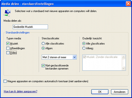 Met de standaardinstellingen krijgt uw gedeelde muziekbibliotheek de naam van uw gebruikersaccount. Als dit niet de bedoeling is, dan is dit eenvoudig te wijzigen. Klik op de XP-pc op de Alt-toets en kies Extra, Opties. Open het tabblad Mediabibliotheek en klik op Delen Configureren. Klik vervolgens op Instellingen en verander de tekst in het veld Media delen als. Eventueel vinkt u hier de optie Nieuwe apparaten en computers automatisch toestaan (niet aanbevolen) aan om computers in uw netwerk automatisch toegang tot de gedeelde bibliotheek te geven.