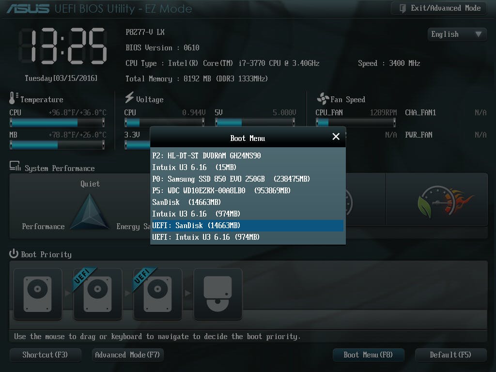 De bedoeling is dat je de installatiestick direct met de pc of laptop opstart. Je dient hiervoor in het systeemmenu van de computer de usb-stick als eerste opstartstation te selecteren. Dit systeemmenu heet in computerjargon het bios of de uefi. Je bereikt het systeemmenu door na het inschakelen van de machine op een specifieke sneltoets van het toetsenbord te drukken. Welke sneltoets dat precies is, verschilt per systeem. Wanneer je F2, F10 en/of Delete uitprobeert, zit je meestal wel goed.