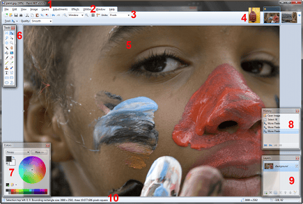 De interface van het programma bestaat uit tien belangrijke delen. In de titelbalk (1) leest u de naam van het bestand. Daaronder staan het menu (2) en de knoppenbalk (3). Rechts bovenaan ziet u miniaturen van de afbeeldingen die geopend (4) zijn. Centraal staat natuurlijk het werkvlak (5). De gereedschapsbalk (6) is zwevend, u kunt die dus naar een andere plaats slepen. In de kleurenkiezer (7) selecteert u voorgrond- en achtergrondkleur. U beschikt tevens over een geschiedenis (8) en over een palet voor de lagen (9). In de statusbalk (10) onderaan krijgt u informatie over iedere optie.