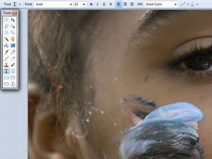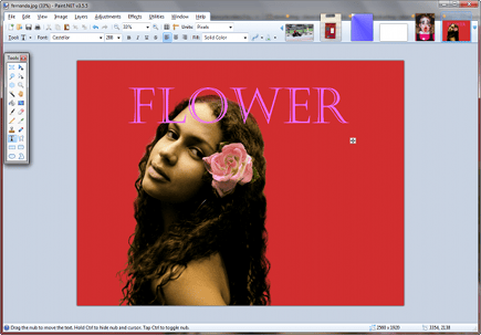 Met het tekstgereedschap brengt u tekst rechtstreeks op de geselecteerde laag aan. In de optiebalk kiest u het lettertype, de lettergrootte en de stijl. Kies een kleur in het palet Colors. Terwijl u tekst ingeeft, krijgt u rechtsonder de tekst een kruisje. Als u dit storend vindt, drukt u de Ctrl-toets in om het te laten verdwijnen. Zolang het kruisje actief is, kunt u de kleur, de grootte, de inhoud en de positie van de tekst wijzigen. Wanneer u eenmaal tevreden bent wordt de tekst op de laag eronder geplaatst en kunt er niets meer aan veranderen.