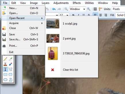 Via het menu File opent en creëert u bestanden. De miniaturen van geopende bestanden verschijnen rechtsboven, de sterretjes markeren de afbeeldingen die u hebt gewijzigd, maar die u nog niet hebt bewaard. Wanneer u met de muisaanwijzer over zo'n miniatuur gaat, verschijnt het sluitvak. Hiermee sluit u niet alleen het miniatuur maar ook het geopende bestand. Via New / Open recent kunt u de laatste acht geopende bestanden bereiken. U kunt tevens bestanden rechtstreeks vanaf de camera of scanner openen. Daarvoor gebruikt u de opdracht New / Acquire / From Scanner of Camera.