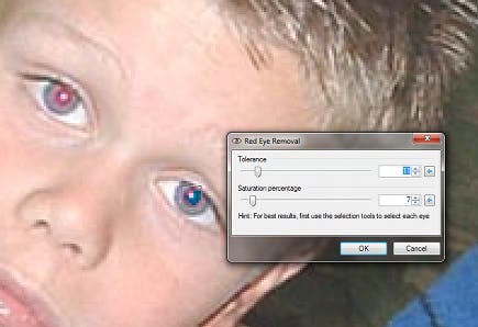 Voor uitsnijden is geen apart gereedschap, maar het kan wel: gewoon met behulp van het rechthoekig selectiegereedschap. Sleep een selectie over de foto en kies Image / Crop to selection. Uw foto wordt bijgesneden. Voor het probleem van rode ogen is er een filter. Zoom in op de ogen met Ctrl++(plus) Selecteer een oog en ga naar Effects / Photo / Red Eye Removal. Versleep de schuifjes Tolerance en Saturation percentage tot de oogpupil de gewenste tint heeft en klik op OK. De instellingen blijven bewaard zodat u ze op dezelfde manier kunt toepassen op het andere oog.